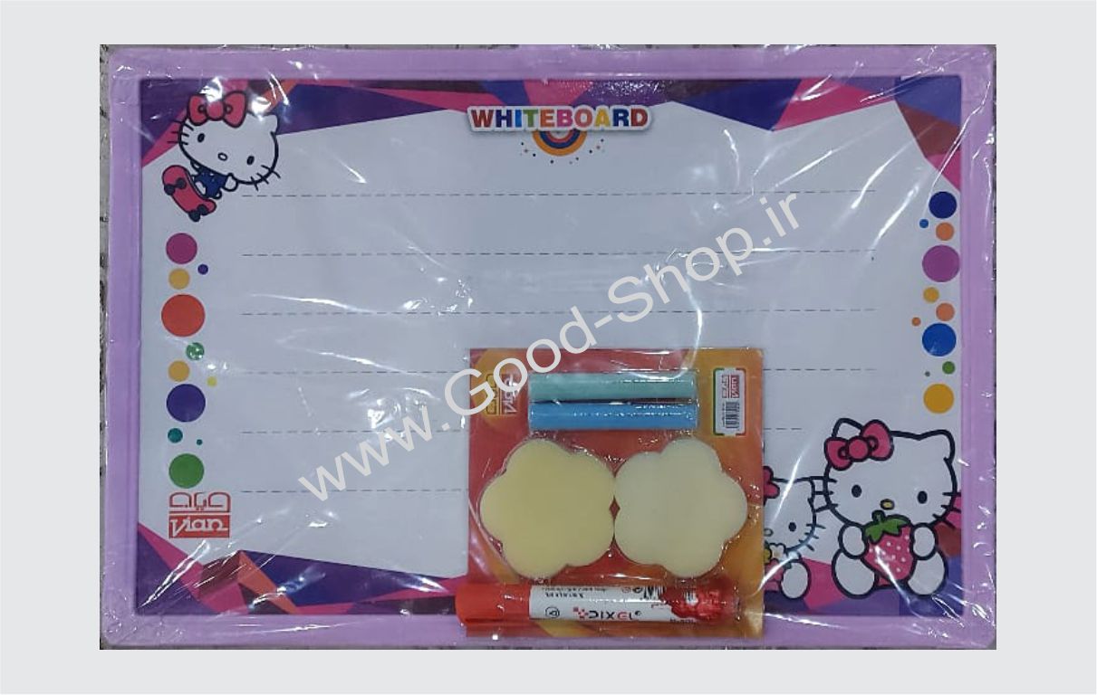 این کالا دارای دو تخته پاک کن، دو عدد گچ با رنگ های مختلف و یک عدد ماژیک وایت برد که سر آن دارای ابری برای پاک کردن است، می باشد.